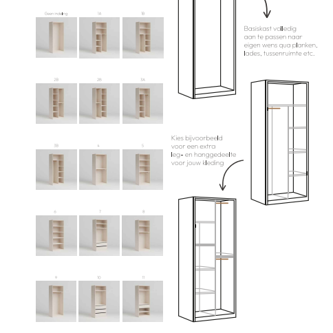 Een belangrijk kenmerk van de Bijnen Store Draaideur Kast is de efficiënte indeling. De kast biedt een combinatie van hangruimte, legplanken en optionele lades, waardoor je jouw kleding overzichtelijk kunt organiseren.