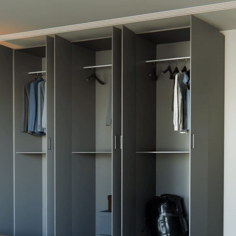 Dankzij de draaideuren kun je alle compartimenten tegelijk openen. Dit zorgt voor een volledig overzicht van je garderobe en maakt het kiezen van je outfit een stuk eenvoudiger. Bovendien benut je de beschikbare ruimte optimaal, omdat de kast volledig toegankelijk is.
