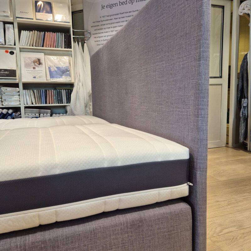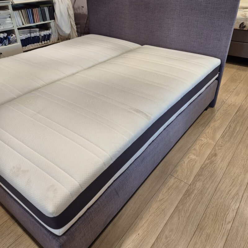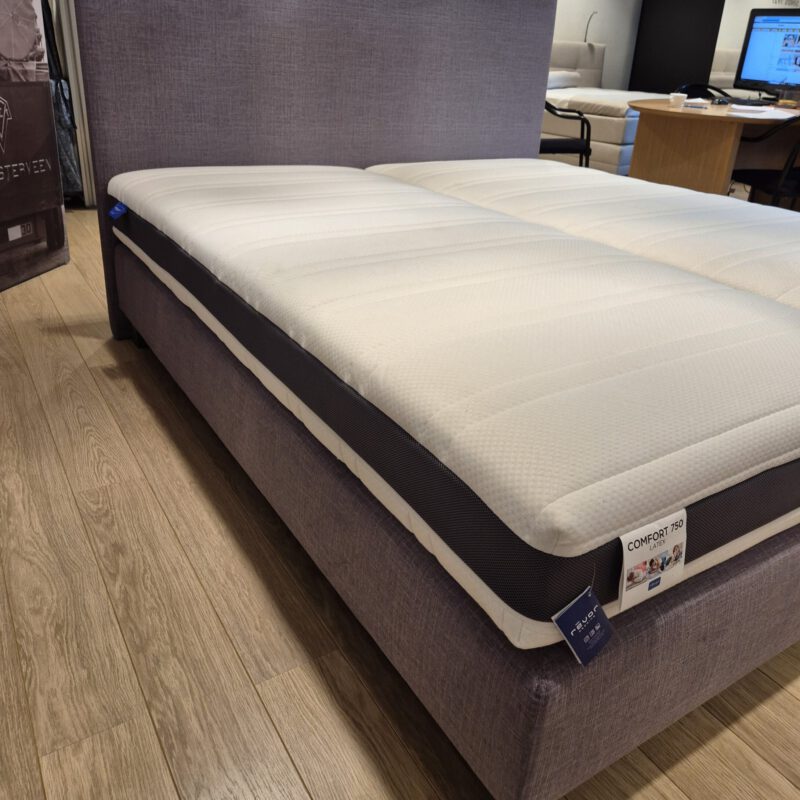 De Revor Be Comfy boxspring showroom model is 180×200 cm en biedt ultiem slaapcomfort tegen een scherpe prijs. De vlakke boxspring wordt geleverd met het Vitello directo hoofdbord van 122 cm hoog, dat een dun en minimalistisch design heeft. Voor optimaal ligcomfort bevat de boxspring 2 Revor Comfort 750 matrassen met latex afdeklaag, 1x medium en 1x stevig. Daarnaast is de boxspring samengesteld met een grijze stof en poten van 12 cm hoog in een grijze kleur.